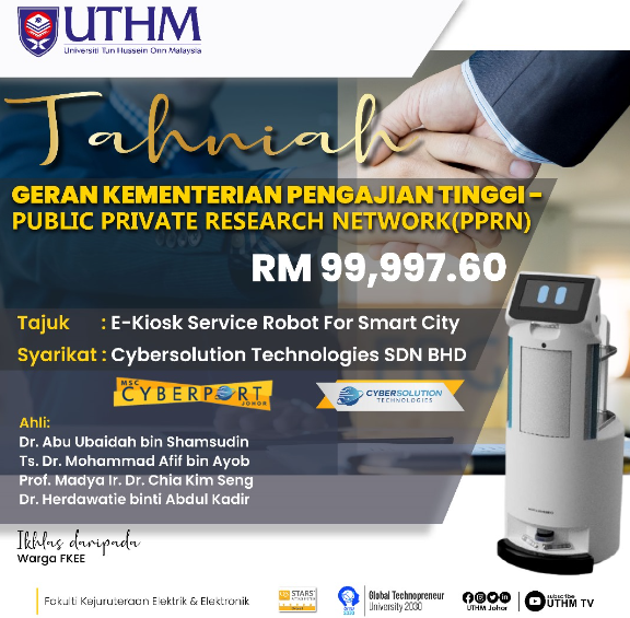 Cybersolution Technologies telah bekerjasama dengan UTHM menjalankan projek E-Kiosk Service Robot for Smart City yang bernilai RM99,997.60. Dari pihak UTHM, Dr. Abu Ubaidah bin Shamsudin dan pasukan telah berjaya mendapatkan geran PPRN bersama syarikat Cybersolution Technologies. Semoga hasilnya akan memberi manfaat kepada semua dan impak yang besar kepada UTHM dan syarikat CTSB.